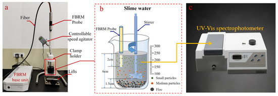 Mnt (90 g) was weighed and placed into a 3 L beaker, and then 3 L of deionized water was added and stirred with an agitator at a shear rate of 350 rad/min for 1 h. The mixture was left to settle for 30 min, and then the upper Na-Mnt suspension was collected. The experimental procedure is illustrated in Figure 10a,b. Briefly, 20 mL of the Na-Mnt suspension was poured into a 100 mL beaker, deionized water was added to dilute it to the 100 mL mark, and then the appropriate 0.15 mol/L CTAC and CPC or 0.08 mol/L HDBAC standard solution was mixed to dilute it to the target concentration. The resulting mixture was stirred with an electric stirrer at a shear speed of 500 rad/min for 5 min. Then, 2 mL of the Mnt supernatant liquid was dispensed into a quartz glass cuvette up to the same level each time, and its transmittance was measured at 930 nm using a UV–Vis spectrophotometer ((JH721, Shanghai Yi Electrical Analysis Instrument Co., Ltd., Shanghai, China), as shown in Figure 10c. The wavelength of 930 nm, located in the near-infrared (NIR) region, was selected because it lies outside the typical absorbance range of montmorillonite and common organic surfactants. As such, any changes in transmission at this wavelength are primarily attributed to light scattering by suspended or flocculated particles, rather than direct molecular absorption. This makes 930 nm a practical accepted choice for assessing turbidity and flocculation behavior in colloidal clay systems following surface modification.