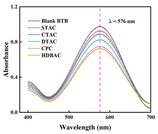 - The determination wavelength was first identified through spectral analysis. In a 50 mL volumetric flask, 2 mL of a QAS solution (0.045 mol/L) was mixed with 2 mL of 0.15% OP-10 solution, 10 mL of 1.6 × 10−4 mol/L bromothymol blue (BTB) solution, and 5 mL of phosphate buffer (pH = 7.7). The mixture was then diluted to volume with deionized water and shaken thoroughly. Using a JH721 UV–Vis spectrophotometer and a 1 cm pathlength cuvette, the absorption spectra of both the blank BTB solution and the BTB–QAS mixture were recorded over the wavelength range of 400–700 nm, with deionized water as the reference.The maximum absorption wavelength (λ = 576 nm) corresponding to the BTB–QAS complex was selected for subsequent measurements. This wavelength ensured optimal sensitivity, accuracy, and reproducibility in quantifying the adsorption capacity of QASs on montmorillonite. The absorption spectra are presented in Figure 11.