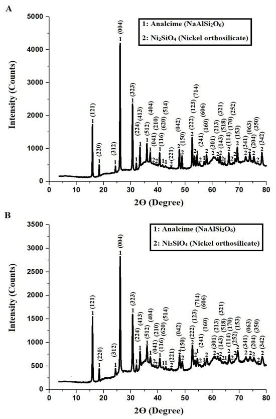 The XRD patterns of the EW and ET nanocomposites are presented in Figure 1A,B, respectively. The EW sample was synthesized by using the hydrothermal method in the absence of polyethylene glycol 400, while the ET sample was synthesized by using the hydrothermal method in the presence of polyethylene glycol 400 as an organic template, followed by calcination at 600 °C for 5 h. The identified crystalline phases in both samples include analcime (NaAlSi2O6) with a monoclinic crystal system (COD-9015469) and nickel orthosilicate (Ni2SiO4) with an orthorhombic crystal system (COD-9001102). The diffraction peaks corresponding to analcime were observed at 2θ angles of 15.94°, 18.35°, 24.33°, 26.01°, 30.64°, 32.10°, 33.36°, 35.88°, 37.14°, 40.60°, 41.66°, 42.69°, 54.35°, 57.07°, and 64.53°, which are assigned to the (121), (220), (312), (004), (323), (224), (413), (512), (404), (116), (620), (514), (714), (606), and (518) crystallographic planes, respectively. The diffraction peaks of nickel orthosilicate appeared at 2θ angles of 38.30°, 39.23°, 44.91°, 47.84°, 48.90°, 52.57°, 53.52°, 55.30°, 57.91°, 60.76°, 62.02°, 62.85°, 63.69°, 66.21°, 67.58°, 68.42°, 69.26°, 72.30°, 73.87°, 75.33°, 76.80°, and 78.38°, corresponding to the (041), (210), (221), (042), (150), (222), (123), (241), (160), (301), (213), (143), (321), (114), (170), (252), (153), (341), (063), (204), (350), and (342) crystallographic planes, respectively. The average crystallite sizes of the EW and ET samples are 72.93 nm and 63.60 nm, respectively, indicating that the presence of polyethylene glycol 400 and its subsequent calcination influenced crystallite growth and morphology. The smaller crystallite size in the ET sample is attributed to the role of polyethylene glycol 400 as a structure-directing agent, which hinders particle agglomeration and promotes the formation of smaller crystallites. Additionally, the calcination step at 600 °C for 5 h further contributes to reducing the crystallite size by removing the organic template and inducing controlled crystallization, preventing excessive grain growth compared with the EW sample, which lacks this templating effect.