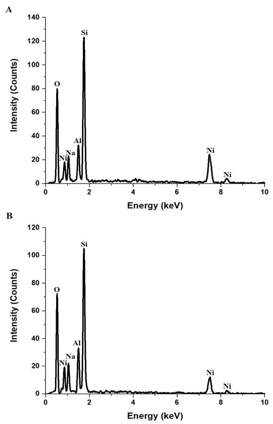 The EDX spectra of the EW and ET nanocomposites are presented in Figure 2A,B, respectively. The elemental composition of both samples, as determined by EDS analysis, is summarized in Table 1. The detected elements include oxygen, sodium, aluminum, silicon, and nickel, confirming the successful formation of the desired phases. The EW sample exhibits atomic percentages of 54.1% oxygen, 9.4% sodium, 6.1% aluminum, 22.1% silicon, and 8.3% nickel, whereas the ET sample shows atomic percentages of 56.0% oxygen, 8.2% sodium, 5.5% aluminum, 21.7% silicon, and 8.6% nickel. The differences in elemental composition between the two samples may be attributed to the presence of polyethylene glycol 400, which, although primarily used as a porosity-directing template, can interact with Al3+, Ni2+, and Si4+ ions during synthesis. These interactions may slightly influence the incorporation or distribution of elements during crystallization. Since polyethylene glycol 400 was added during the precursor mixing stage and remained throughout the hydrothermal process, it likely affected the co-crystallization of both the analcime and nickel orthosilicate phases, leading to the improved morphology and surface characteristics observed in the ET sample.