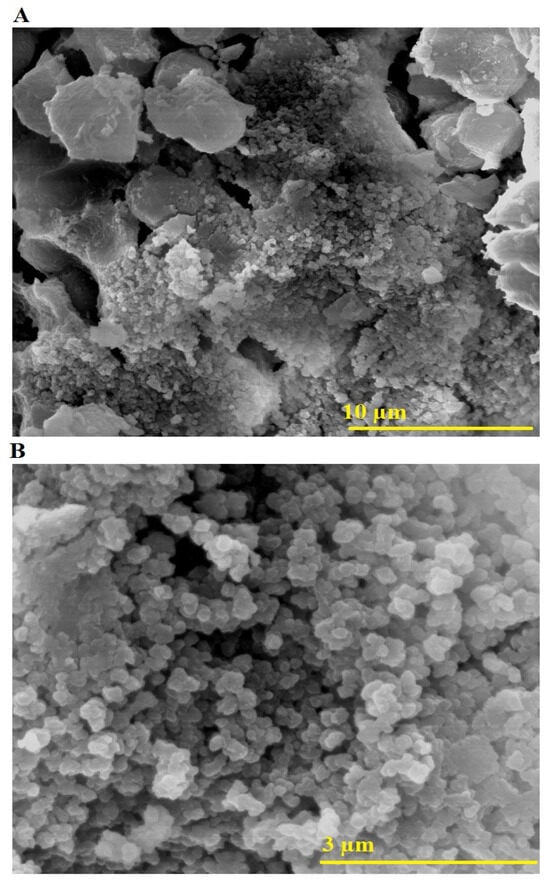 The FE-SEM images of the EW and ET nanocomposites are shown in Figure 3 and Figure 4, respectively, providing insights into their morphological features. Figure 3A illustrates the EW sample at 10,000× magnification, revealing a heterogeneous structure with a combination of large, irregularly shaped agglomerates and smaller dispersed particles. Figure 3B at 40,000× magnification highlights the presence of fine nanoparticles with a rough surface texture, indicating a less uniform growth pattern. Figure 4A presents the ET sample at 10,000× magnification, showing a more uniform morphology with well-distributed spherical nanoparticles, suggesting the role of polyethylene glycol 400 as a template in controlling particle growth. Figure 4B at 40,000× magnification further confirms the formation of spherical nanoparticles with a relatively smooth surface and reduced agglomeration compared with the EW sample. The observed morphological differences between the two samples can be attributed to the presence of polyethylene glycol 400 during synthesis, which facilitated the formation of smaller and more uniform spherical nanoparticles in the ET sample while inhibiting excessive particle aggregation. The calcination step at 600 °C for 5 h further influenced the structural organization by removing the organic template, leading to a well-defined morphology in the ET sample compared with the irregular structures observed in the EW sample.