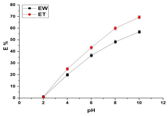 Influence of pH on rhodamine B dye removal efficiency (% E) of EW and ET nanocomposites.