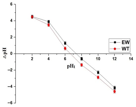 The pHPZC of EW and ET nanocomposites was determined by using the batch adsorption method with potassium chloride (KCl) as the supporting electrolyte. A series of 50 mL KCl solutions (0.01 M) were prepared, and their initial pH (pHI) was adjusted in the range of 2 to 12 by using either hydrochloric acid or sodium hydroxide. A fixed amount of 100 mg of the nanocomposite was added to each solution, and the mixtures were continuously stirred for 24 h at room temperature to ensure equilibrium. After equilibrium was reached, the final pH (pHF) of each solution was measured. The difference between the final and initial pH values (ΔpH) was calculated by using Equation (11) [34].