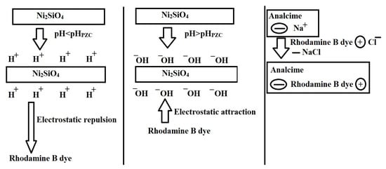 The rhodamine B dye removal efficiency of EW and ET nanocomposites is highly pH-dependent, as illustrated in Figure 6. At pH 2, the removal percentages for EW and ET are significantly low, reaching only 0.91% and 1.28%, respectively. This poor adsorption performance is attributed to the surface charge characteristics of the nanocomposites under highly acidic conditions, as explained in Figure 7. The points of zero charge (pHPZC) for EW and ET are 7.34 and 6.57, respectively, indicating that at pH 2, both materials exhibit a positively charged surface. Since rhodamine B dye is a cationic dye, electrostatic repulsion occurs between the positively charged nickel orthosilicate phase in the nanocomposites and the dye molecules, leading to minimal adsorption, as illustrated in Figure 8. Moreover, at this pH, the analcime phase does not effectively contribute to dye removal through ion exchange because of the high concentration of hydrogen ions in solution, which compete with the dye molecules for exchange sites. At pH 10, the removal efficiency increases significantly, reaching 56.84% for EW and 69.44% for ET. This improvement is due to the shift in surface charge beyond pHPZC, where the nickel orthosilicate phase develops a negatively charged surface that strongly attracts the cationic rhodamine B dye via electrostatic attraction, as shown schematically in Figure 8. Additionally, while the analcime phase is known for its ion-exchange capacity, the rhodamine B cation is relatively large (~1.8 nm) compared with the typical pore diameter of analcime (~0.3–0.4 nm) [29,31]. Therefore, complete intrapore ion exchange is unlikely. Instead, the interaction likely occurs at the external surfaces or at intercrystalline boundaries, where exchangeable sodium ions may still be accessible, contributing to the overall adsorption process. The higher removal efficiency of ET compared with EW is attributed to its lower pHPZC, which allows it to acquire a negative charge at a lower pH, facilitating stronger electrostatic attraction with dye molecules. Additionally, the presence of polyethylene glycol 400 during ET synthesis improves its porosity and surface area, increasing the number of available active sites for both electrostatic attraction and ion exchange mechanisms. The correlation between adsorption behavior and the dual removal mechanisms confirms that nickel orthosilicate primarily removes rhodamine B via electrostatic attraction, while analcime enhances dye removal through ion exchange.