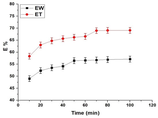 Time-dependent rhodamine B dye removal efficiency (% E) of EW and ET nanocomposites.