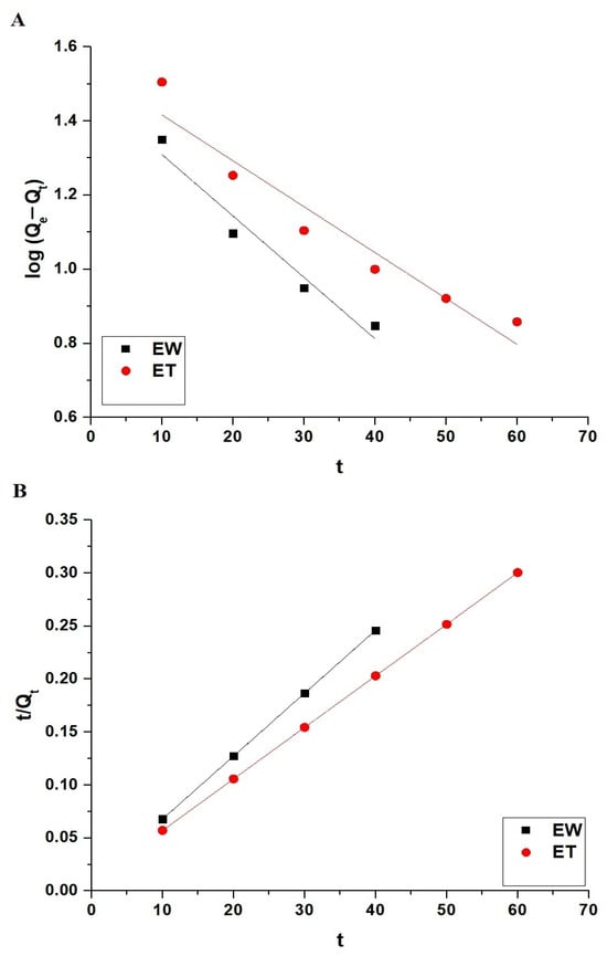 The kinetics of rhodamine B dye adsorption onto EW and ET nanocomposites were analyzed by using the pseudo-first-order and pseudo-second-order kinetic models, as shown in Figure 10A,B, respectively. The pseudo-first-order model is described by Equation (3) [33].