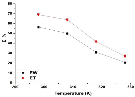 Effect of temperature on rhodamine B dye removal efficiency (% E) of EW and ET nanocomposites.