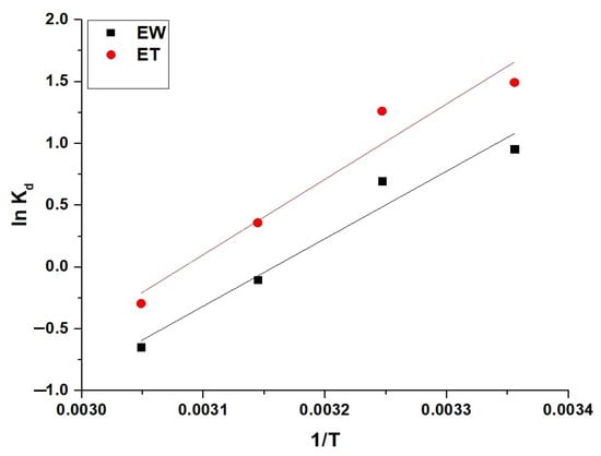The thermodynamic parameters for the adsorption of rhodamine B dye onto EW and ET nanocomposites were determined by using Equations (5)–(7) [34,35].
