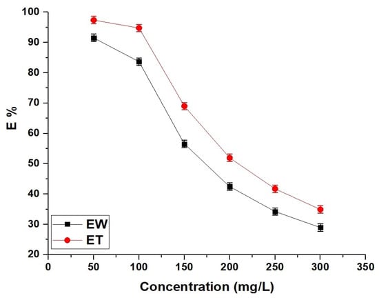 The efficiency of rhodamine B dye adsorption onto EW and ET nanocomposites is influenced by the initial dye concentration, as shown in Figure 13. At a low concentration of 50 mg/L, the removal efficiencies of EW and ET are 91.52% and 97.38%, respectively, indicating that both nanocomposites exhibit high adsorption capacity when sufficient active sites are available. As the concentration increases to 300 mg/L, the removal efficiencies decrease to 28.95% for EW and 34.92% for ET, demonstrating that the adsorption process becomes less effective at higher dye concentrations. This decline is attributed to the saturation of available adsorption sites, leading to reduced efficiency in capturing additional dye molecules from the solution. The consistently higher removal efficiency of ET compared with EW at both low and high concentrations suggests that ET possesses a greater number of active sites and enhanced surface characteristics that facilitate higher dye uptake. The observed trend confirms that adsorption efficiency is inversely related to initial dye concentration due to the progressive saturation of active sites on the nanocomposites.