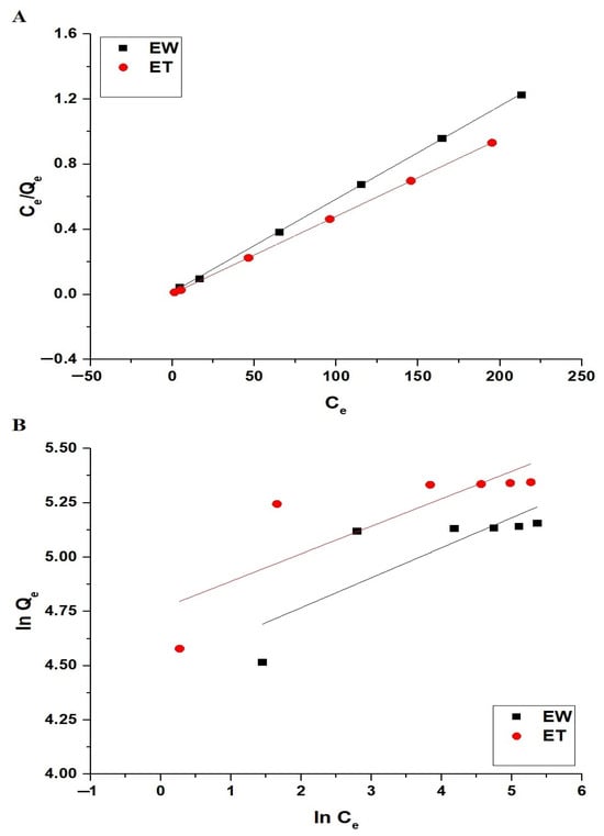 The adsorption behavior of rhodamine B dye onto EW and ET nanocomposites was analyzed by using the Langmuir and Freundlich isotherm models, as shown in Figure 14. The Langmuir isotherm is described by Equation (8) [36].