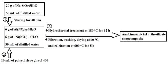 The analcime@nickel orthosilicate nanocomposites were synthesized through a hydrothermal method. Initially, 20 g of Na2SiO3·5H2O was dissolved in 50 mL of distilled water. In a separate beaker, 6 g of Al(NO3)3·9H2O and 6 g of Ni(NO3)3·6H2O were dissolved in 50 mL of distilled water. The sodium metasilicate solution was then gradually added to the nitrate solution under continuous stirring for 30 min. Following this, 10 mL of polyethylene glycol 400 was introduced into the mixture and stirred for an additional 30 min. The resulting mixture was transferred into a 150 mL Teflon-lined stainless-steel autoclave and subjected to hydrothermal treatment at 180 °C for 12 h. After cooling to room temperature, the formed precipitate was separated by filtration, washed with distilled water to remove residual impurities, dried at 60 °C, and subsequently calcined at 600 °C for 5 h to obtain the analcime@nickel orthosilicate nanocomposite (ET). To synthesize the analcime@nickel orthosilicate nanocomposite (EW), the same procedure was repeated in the absence of polyethylene glycol 400, where 10 mL of distilled water was used instead. Figure 15 illustrates the synthesis process of the analcime@nickel orthosilicate nanocomposites.
