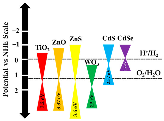 Various semiconductors have been explored for photocatalytic applications. While many demonstrate promising characteristics, their long-term viability is often hindered by high charge recombination rates, poor stability in aqueous environments, or toxicity [25,26,27,28,29]. Among the most studied are n-type semiconductors with wide bandgaps, such as CdS, WO3, and ZnO (Figure 1) [30,31]. These materials possess favorable conduction and valence band positions for photocatalysis; however, their large energy bandgaps (EBG) necessitate ultraviolet (UV) irradiation for activation. This is a significant limitation, as the majority of solar radiation falls within the visible spectrum (~480 nm), with only a small fraction in the UV range. On the other hand, semiconductors like CdS, CdSe, ZnS, and PbS exhibit narrower bandgaps (~2 eV), enabling excitation by visible light [16,28,32,33]. Despite this advantage, their inherent toxicity and instability in aqueous media severely restrict their practical application in photocatalytic systems.