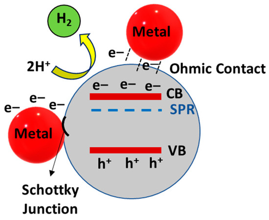 Doping TiO2 with transition metal nanoparticles has gained significant interest in improving photocatalysis through the surface plasmon resonance (SPR) phenomenon [48,49]. In this process, noble metals such as Au, Pt, and Ag exhibit strong SPR effects in the visible range. At elevated temperatures, the SPR effect is further enhanced, leading to increased photocatalytic activity (Figure 2).