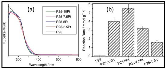 (a) UV–visible spectra of Pt and P25 samples (b) Hydrogen evolution rate, per gram of catalyst, in the 1:9 CH3OH: H2O mixture [60]. Reproduced from ref. [60] with permission from Elsevier, License number 5600041458742.