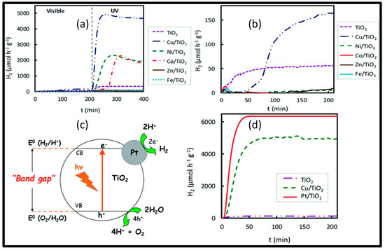 Hydrogen production for impregnated M/TiO2 photocatalysts (M = Fe, Co, Ni, Cu, Zn), 2 wt% M; (a) under both visible and UV light irradiation, (b) under visible lamp irradiation, (c) schematic diagram of the water-splitting reaction on Pt/TiO2 and (d) comparison of the catalytic activity of bare commercial TiO2, 2 wt% Cu/TiO2 and 2 wt% Pt/TiO2 in the hydrogen photoproduction under UV irradiation. Reproduced from ref. [64] with permission from the Royal Society of Chemistry.