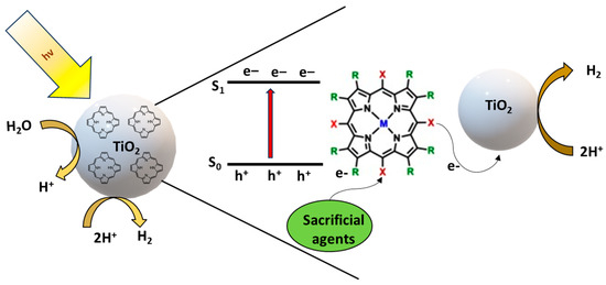 In porphyrin-doped TiO2 systems, photocatalytic hydrogen production relies on the efficient separation of charge carriers (electrons and holes) generated under visible light. The mechanism typically involves three main steps: light absorption, electron transfer and hole scavenging and redox reactions. Porphyrins, with their extensive π-conjugated systems, strongly absorb visible light (400–700 nm). The excited electron is transferred to the conduction band of TiO2 (Scheme 2), enabling TiO2 to utilize visible light, which it normally cannot absorb. These conduction band electrons participate in water reduction to generate hydrogen (H2), while the holes remain in the porphyrin molecule. To prevent electron–hole recombination, a sacrificial agent—typically an electron donor such as methanol or ethanol—quenches the hole in the porphyrin (Scheme 2). This maintains charge separation, ensuring continuous hydrogen production. Additionally, cocatalysts like platinum (Pt) can enhance electron transfer and improve hydrogen evolution efficiency. Porphyrins play a crucial role in extending TiO2’s light absorption into the visible spectrum, which accounts for approximately 43% of solar radiation. This significantly enhances the photocatalytic efficiency of hydrogen production [14,77,78,79,81].