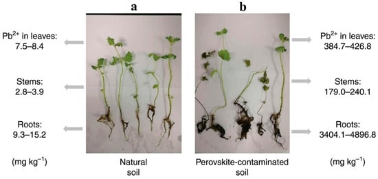 Lead concentration in different parts of mint plants grown in (a) control soil and (b) perovskite-contaminated soil. Reprinted with permission from Ref. [38]. Copyright 2020 Springer Nature.