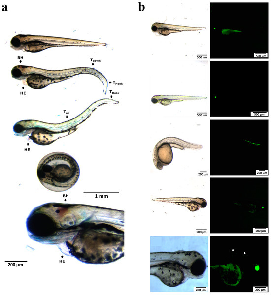 (a) PbI2-induced morphologically defective phenotypes of Danio rerio and the amplification of a cerebrovascular defect in PbI2-treated group. (b) Stereo (left) and fluorescence (right) images of Tg(hsp70l:GFP) of embryos treated with different PbI2 concentrations. Reprinted with permission from Ref. [24]. Copyright 2016 Springer Nature.