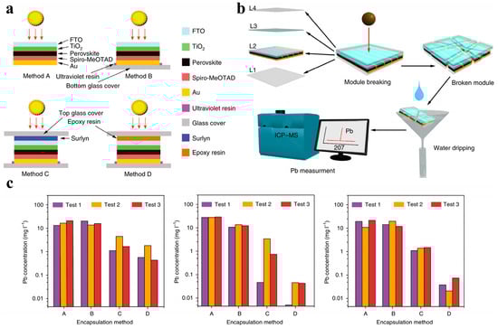 (a) Schematic diagram of four encapsulation methods. (b) Schematic diagram of Pb leakage test for perovskite solar module damaged by external impact. (c) Lead concentration test under different experimental conditions. Reprinted with permission from Ref. [66]. Copyright 2019 Springer Nature.