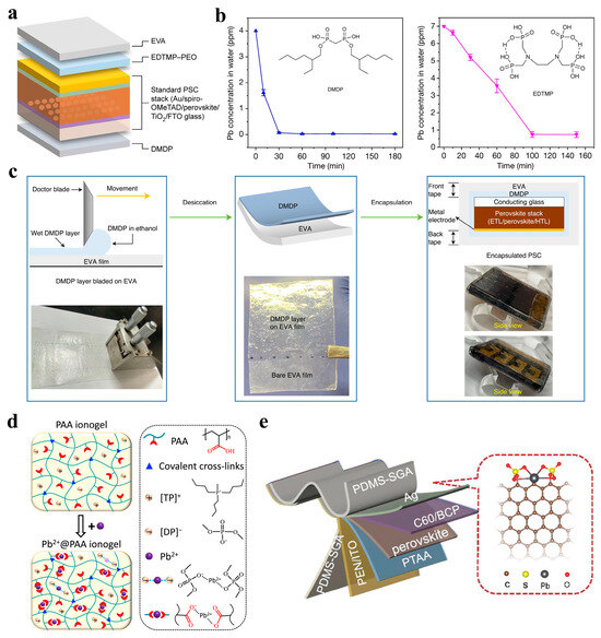 (a) The device structure consists of two lead absorbing films (DMDP and EDTMP-PEO). (b) Chemical structure and lead trapping capacity of DMDP and EDTMP. Reprinted with permission from Ref. [45]. Copyright 2020 Springer Nature. (c) The fabrication and encapsulation process of DMDP and EVA. Reprinted with permission from Ref. [72]. Copyright 2021 Springer Nature. (d) Scheme of ionogel microstructure and lead adsorption mechanism. Reprinted with permission from Ref. [73]. Copyright 2021 AAAS. (e) Schematic of flexible PSCs encapsulated with S-GA/PDMS mixture on both the front side and back side. Reprinted with permission from Ref. [74]. Copyright 2021 Wiley-VCH.