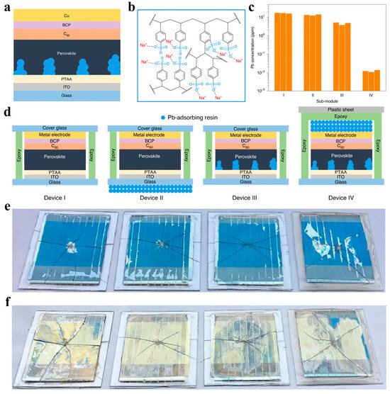 An effective approach involves directly incorporating lead-absorbing materials into the perovskite layer to enhance both its stability and lead capture ability. Chen et al. [70] reported an impressive work, where they developed a novel approach to mitigate lead leakage from damaged perovskite solar modules by incorporating a mesoporous sulfonic acid-based cation exchange resin (CER) directly into the perovskite layer, as shown in Figure 7a. The resin, composed of a cross-linked styrene-divinylbenzene copolymer functionalized with sulfonic acid groups (Figure 7b), operates through a dual mechanism of “ion exchange” and “physical blocking”. The sulfonic acid groups act as active adsorption sites, where the Na+ ions in the resin undergo ion exchange with Pb2+ ions from decomposed perovskites under aqueous conditions (e.g., acidic rainwater). This process is driven by the strong affinity of sulfonic acid groups for divalent cations like Pb2+, effectively trapping them within the resin’s porous matrix. The mesoporous structure further enhances adsorption capacity by providing a high density of accessible binding sites and prolonging the interaction time between Pb2+ and the resin. The authors systematically evaluated Pb leakage in perovskite modules with varying encapsulation strategies through water-dripping tests, simulating highly acidic rainfall conditions (Figure 7c–f). As evidenced by the results of lead leaching concentrations in Figure 7c, the strategy of embedded mesoporous CER within the perovskite layer (Device III) is more effective in preventing lead leakage than just coating lead capture materials on the device’s surface (Device II). This built-in lead adsorption framework serves as the first layer of protection against lead leakage, which can be further combined with appropriate external encapsulation to synergistically produce better lead leakage inhibition results, achieving an impressive lowest Pb concentration of 11.9 ± 1.4 ppb.