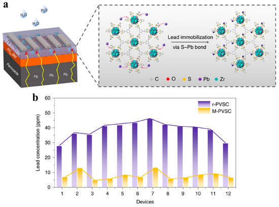 (a) Schematic illustration of the lead immobilization by the S-Pb bond between the perovskite and ZrL3. (b) Test of Pb concentration in the contaminated water. Reprinted with permission from Ref. [76]. Copyright 2020 Springer Nature.