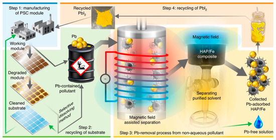 Recent advancements have yielded multiple methodologies for the extraction and recovery of lead [33,78,79,80,81]. Park et al. first used dimethylformamide (DMF) to remove the metal electrode, charge transport layer, and dissolved perovskite (Figure 10) [82]. They employed surface negatively charged iron-modified hydroxyapatite (HAP/Fe) hollow composites, effectively reducing lead concentration to below 15 ppb. Due to the difference in water solubility between HAP/Fe and PbI2, adding 1 M KI solution can recover PbI2 with a recovery rate as high as 99.97%. Finally, they fabricated a device using the recovered materials and achieved a PCE of approximately 18%, comparable to that achieved with commercial PbI2.