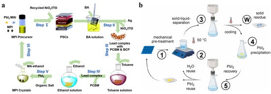 - Schmidt, F.; Amrein, M.; Hedwig, S.; Kober-Czerny, M.; Paracchino, A.; Holappa, V.; Suhonen, R.; Schäffer, A.; Constable, E.C.; Snaith, H.J.; et al. Organic solvent free PbI2 recycling from perovskite solar cells using hot water. J. Hazard. Mater. 2023, 447, 130829. [Google Scholar] [CrossRef]