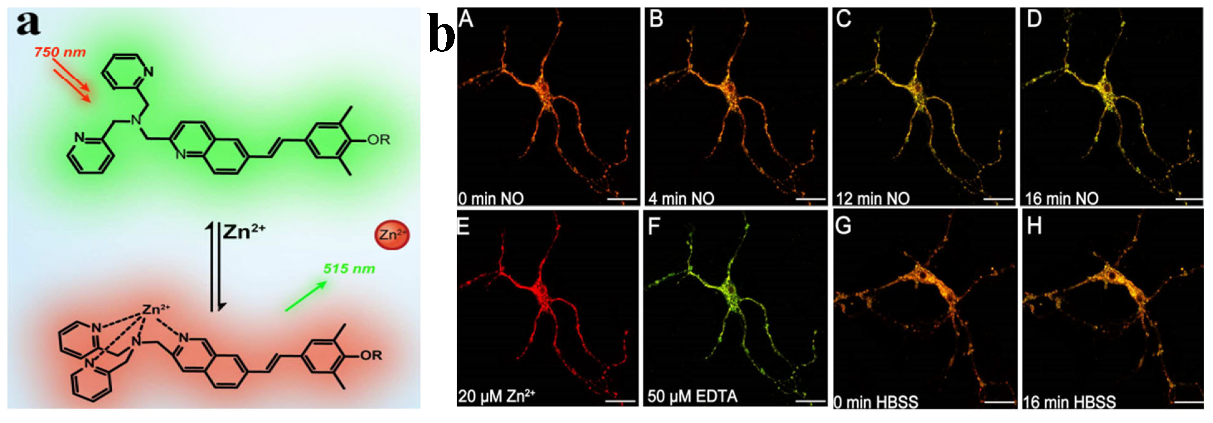 Figure 9. (a) Schematic of the response mechanism of probe TEO-MPVQ to Zn2+; (b) The fluorescence changes of 5µM TEO−MPVQ in NO-induced neurons. In TEO−MPVQ, the fluorescence images of NO at different time points before incubation (A) and after incubation were: (B) 4 min, (C) 12 min, (D) 16 min. The image after 10µM Zn2+/pyrithione (1:2) processing is (E), and the image after 20 µM EDTA processing is (F). HBSS processed fluorescence images of neurons at 0 min (G) and 16 min (H) [61].