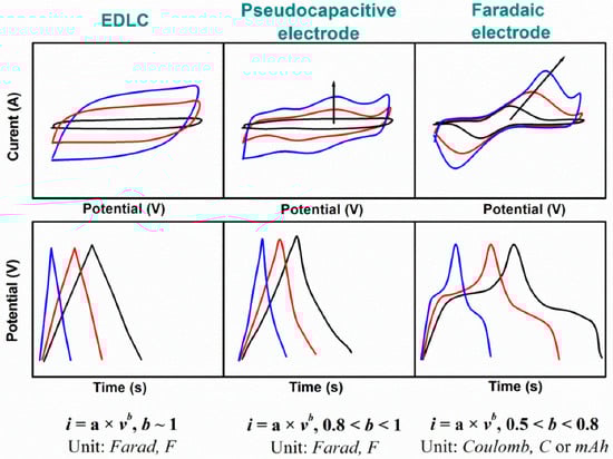Hydrogen is often regarded as the ultimate energy carrier. Traditional methods of storing hydrogen as a gas or liquid have several drawbacks, which make electrochemical hydrogen storage a more advantageous alternative. When using this method, atomic hydrogen is directly absorbed into the storage material through the electrochemical breakdown of an aqueous solution. This avoids the need to split molecular hydrogen into atomic hydrogen, overcoming a major challenge in hydrogen storage. However, electron and proton absorption mechanisms differ considerably [36]. Energy storage devices, such as capacitors, batteries, and supercapacitors, store electrical charge, but their mechanisms for doing so differ. Dielectric capacitors store energy electrostatically, while batteries utilize diffusion-based storage mechanisms that involve redox (reduction–oxidation) processes, which depend on the specific Faradaic materials used [37,38]. This classification is illustrated in Figure 5. Additionally, there are notable differences in the cyclic voltammetry (CV) profiles, which display the current response to linear changes in potential, and the galvanostatic charge–discharge (GCD) curves, which indicate these devices’ charging or discharging rates [38].