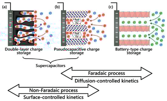 Illustration of the electrode processes occurring at electrical double-layer capacitive (a), pseudocapacitive (b), and Faradaic (c) electrodes (Copyright Wiley, 2019) [44].