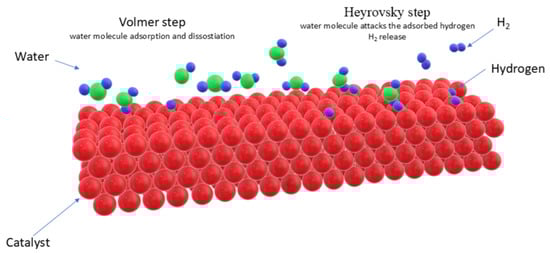 Schematic diagrams for the Volmer step and Heyrovsky step of the HER reaction (redrawn based on [48]).
