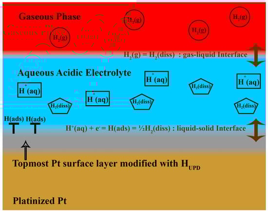 The layer of underpotential deposited hydrogen (UPD H) on the Pt surface modifies its hydrophilic and hydrophobic characteristics, resulting in weaker interactions between water molecules at the electrolyte–platinum interface and the Pt surface. Research indicates that hydrogen production occurs not on pure Pt but on Pt with a UPD H monolayer. This process is enhanced due to the weaker interactions of water molecules with the Pt surface. Therefore, as depicted in Reaction 12, the overall reaction can also be illustrated, as shown in Figure 9. The final product, H2(diss), may form via the Volmer–Tafel or the Volmer–Heyrovsky mechanism [40].