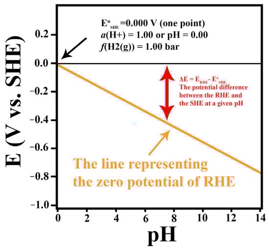 In this context, ESHE refers to the potential measured with reference to the standard hydrogen electrode (SHE), while Em,RE denotes the potential measured relative to a reference electrode. ERE represents the reference electrode’s potential (standard or nonstandard) compared to the SHE. Figure 12 compares the potential scales of the standard hydrogen electrode (SHE), the reversible hydrogen electrode (RHE) at a pH of 2.00 with hydrogen gas at 1.00 bar, and the standard silver–silver chloride electrode with a chloride ion activity of 1.00. Figure 12 highlights that the onset potentials for various electrochemical processes, such as the hydrogen evolution reaction/hydrogen oxidation reaction (HER/HOR) and the oxygen evolution reaction/oxygen reduction reaction (OER/ORR), vary significantly across different potential scales [48,55].