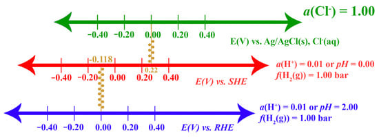 Comparison of the potential scales of the SHE, the RHE (for a(H+) = 1 f(H2) = 1 bar), and the standard silver–silver chloride electrode (a(Cl−) = 1) (redrawn based on [55]).