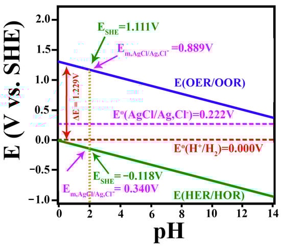 Graphical representation of the HER/HOR and OER/ORR onset potentials, which were measured using a standard hydrogen electrode (SHE), a reversible hydrogen electrode (RHE), and a standard silver–silver chloride electrode (redrawn based on [55]).