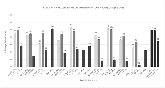 Of the nine lanthanides tested at 0.01 mM, the cell responses to only Pr, Sm, Eu, Tm, and Yb were significantly different (p < 0.05) from those of saline, as shown in Figure 2. The Percent of Average Saline Control values for these lanthanides were 82, 86, 104, 87, and 77%, respectively. The results for La, Ce, Ho, and Er were similar to (p > 0.05) saline, with Percent of Average Saline Control values of 96, 93, 93, and 102%, respectively. Of the nine lanthanides test at 0.1 mM, only Ho and Yb were significantly different (p < 0.05) from the saline control cells. The Percent of Average Saline Control values for these lanthanides were 87 and 83%, respectively. The results for La, Ce, Pr, Sm, Eu, Er, and Tm were not significantly different from (p > 0.05) the saline control cells, with Percent of Average Saline Control values of 100, 95, 96, 94, 98, 101, and 92%, respectively. Of the 13 lanthanides tested at 1 mM, all lanthanides, except Nd, were significantly different (p < 0.05) from the saline control cells. The Percent of Average Saline Control values for these lanthanides were 78, 65, 72, 69, 73, 73, 78, 58, 59, 58, 52, and 72%, with the 1 mM Yb having the largest negative effect on cell viability under these conditions.