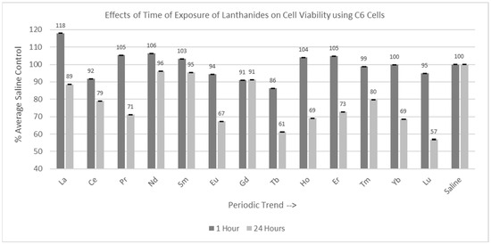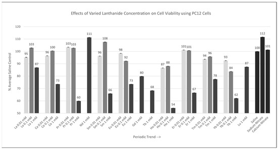 Experiments were conducted with both C6 and PC12 cells with the various lanthanides using two different incubation times: 1 hr and 24 hr, as shown in Figure 4 and Figure 5. Thirteen lanthanides, with a final concentration of 1 mM, were used in these trials.