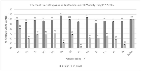 Of the 13 lanthanides tested for the one-hour incubation period, all were significantly different (p < 0.05) from the saline control cells, as shown in Figure 4. However, many of the Percent of Average Saline Control values were greater than or close to 100%. The Percent of Average Saline Control values were 118, 92, 105, 106, 103, 94, 91, 86, 104, 105, 99, 100, and 95%, respectively. Of the 13 lanthanides tested for the 24 hr incubation period, 11 lanthanides (La, Ce, Pr, Eu, Gd, Tb, Ho, Er, Tm, Yb, and Lu) were significantly decreased (p < 0.05) relative to the saline control cells, with Lu having the most negative effect on cell viability. The Percent of Average Saline Control values for these lanthanides were 89, 79, 71, 67, 91, 61, 69, 73, 80, 69, and 57%, respectively. Nd and Sm were not significantly different from (p > 0.05) the saline control cells, with Percent of Average Saline Control values of 96 and 95%, respectively.
