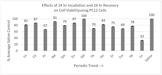 As shown in Figure 7, of the 13 lanthanides tested with the PC12 cells, only Gd was not statistically different from the saline control cells, with a Percent of Average Saline Control value of 100%. The other 12 lanthanides were significantly different (p < 0.05) to the saline control cells. The PC12 cells were also the most negatively affected by Lu exposure.