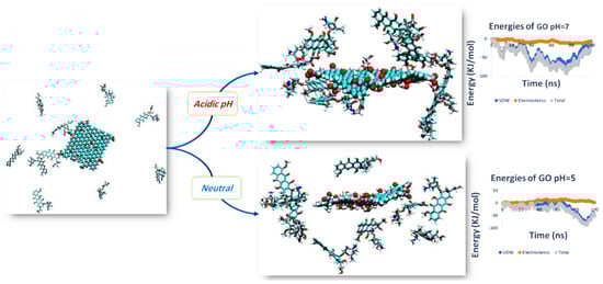 Figure 5. Molecular dynamics simulations depicting the interaction behavior of GO and doxorubicin (DOX) at different pH conditions [39].