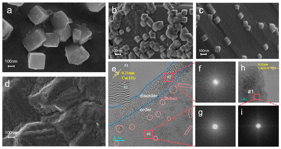 The SEM images of (a) AS−Cu−3, (b) AS−Cu−5, (c) AS−Cu−7, and (d) ED−Cu. (e–g) The HRTEM images of AS−Cu−5 and FFT patterns. (h,i) The HRTEM images of ED−Cu and FFT patterns.