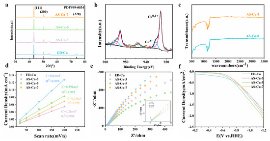 (a) XRD of AS−Cu−3, AS−Cu−5, AS−Cu−7, and ED-Cu; (b) XPS spectra of AS−Cu−5; (c) FTIR spectra of AS−Cu−3, AS−Cu−5, AS−Cu−7, and ED−Cu; (d) double-layer capacitance measurement of AS−Cu−3, AS−Cu−5, AS−Cu−7, and ED-Cu; (e) Nyquist plots over AS−Cu−3, AS−Cu−5, AS−Cu−7, and ED−Cu; (f) LSV of AS−Cu−3, AS−Cu−5, AS−Cu−7, and ED-Cu in CO2−saturated 0.1 M KCl.