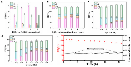 CO2RR performance in CO2−saturated KCL. (a) CO2RR performance of different additive amounts. (b) CO2RR performance at various deposition times. The FE at different applied potentials over (c) ED−Cu and (d) AS−Cu−5. (e) Stability test at −1.2 V vs. RHE of AS−Cu−5.