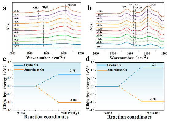 In situ ATR−SEIRAS spectra of (a) ED−Cu and (b) AS−Cu−5. (c) Free energy diagram of the process from CHO to *CH2O on crystal Cu and amorphous Cu. (d) Free energy diagram of C−C coupling on crystal Cu and amorphous Cu.