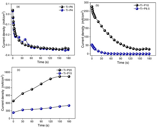 Figure 1 shows the current density profiles of the anodization of titanium samples in a 0.3 M NaCl electrolyte. In Figure 1a, the current density observed at 4 V and 6 V is shown; the applied potential is below the threshold required for oxidation [16] and, therefore, does not lead to oxide formation. Figure 1b presents the current density observed at 8.5 V and 10 V. At 8.5 V, a current density of 52 mA/cm2 was observed, which gradually decreased to approximately 0 mA/cm2. At 10 V, an initial current density of 276 mA/cm2 was recorded, and as the oxidation process progressed, the current density decreased to 26 mA/cm2. In Figure 1c, increasing current curves are observed without reaching the formation/dissolution equilibrium. The anodization profile at 15 V and 20 V suggests a dissolution rate higher than the oxide formation rate, which prevents the growth of the film thickness.
