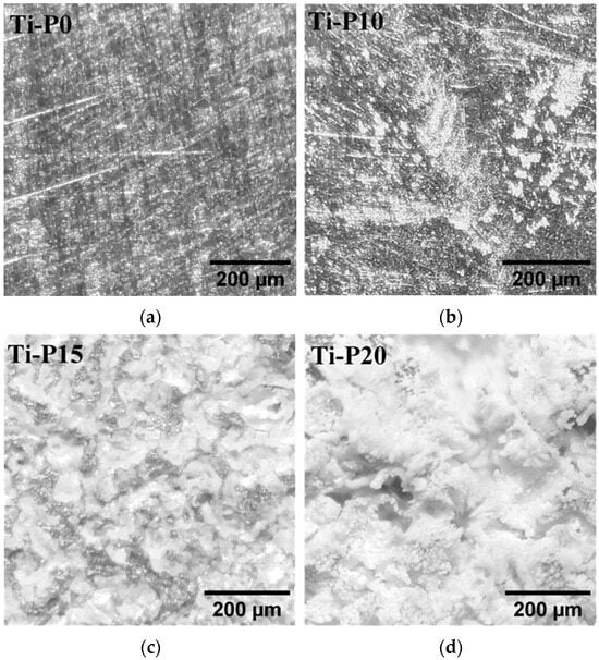 Optical micrographs of anodized samples at different voltages are illustrated in Figure 2. Starting with Figure 2b, Ti-P10, a significant change is observed—the formation of small white spots with an approximate diameter of 30 μm. These spots increase in both number and size in Figure 2c, Ti-P15, and Figure 2d, Ti-P20, indicating the development of a film on the substrate surface. This film becomes denser and more uniform in Ti-P20, marking a clear advancement in our understanding of the anodization process.