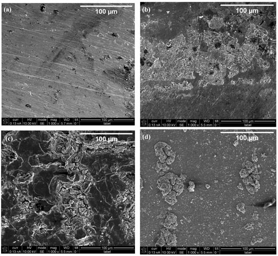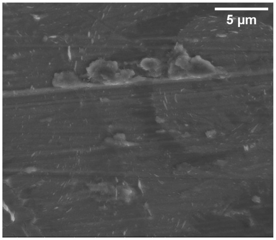 The micrographs obtained by scanning electron microscopy are shown In Figure 3a, showing a plain Ti surface after mechanical grounding; it can be observed that this treatment generated fine grooves on the surface. Similar results were observed by Salih Durdu et al. when anodizing titanium plates using 180, 240, 400, 800, 1000, and 2000 SiC sandpapers [17]. Additionally, some imperfections resembling clusters presumably of the same metal as the plain Ti are present.