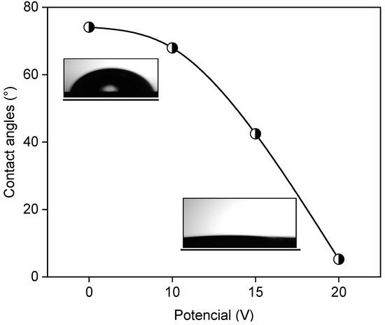 Complementary to morphological properties, the wettability properties of the modified substrates and titanium oxide-free substrate were determined by measuring the contact angles, θ. Figure 8 shows the contact angle values as a function of the applied potential during the anodization process. The results show a clear trend towards smaller contact angle values, from approximately 74° to 5°, as the applied potential increases from 0 V to 20 V.