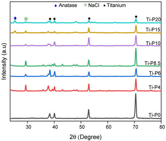 The X-ray diffractograms of TiP0, TiP-10, TiP-15, and TiP-20 samples are shown in Figure 9. In the TiP15 and TiP20 samples, it can be observed that titanium dioxide crystallized in its anatase form, which was identified by its characteristic signal at 25.3° [9,15,21]. The NaCl was used as the electrolyte, and according to the X-ray analysis, it is prevalent on the surface of the substrates. On the other hand, the titanium plate used as substrate shows only the signals corresponding to titanium [8,22,23].